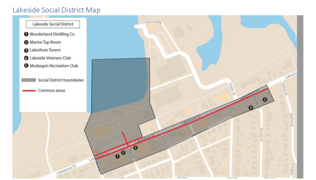The Lakeside Social District provides common areas in Lakeside in which alcoholic beverages from participating establishments can be carried and consumed. Lakeside establishments in conjunction with the City of Muskegon have created this district to provide a year-round, festival atmosphere in Lakeside.