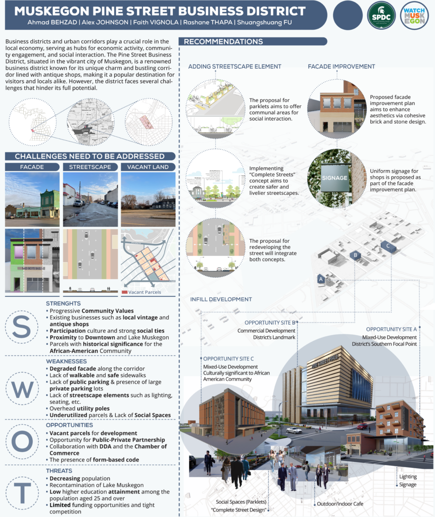 The City of Muskegon Planning Department, Downtown Development Authority, and Muskegon Lakeshore Chamber of Commerce partnered with students from the Michigan State University Urban and Regional Planning program to complete a Pine Street Business District Improvement Plan as part of their final semester practicum course. The five-student practicum team visited Muskegon in January 2023 to tour the district and meet with City staff and Pine Street business owners. In early February 2023, the team hosted a public charette at the Muskegon Farmers Market. The final plan was presented on the MSU campus and with at a gathering of Pine Street stakeholders in May 2023.
