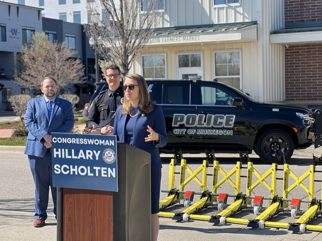 Congresswoman Hillary Scholten visited the City of Muskegon to announce a $380,000 grant award on Thursday, April 25, 2024. The grant funds will purchase a Modular Vehicle Barrier System (MVBS) which will increase safety at large events in Muskegon.
