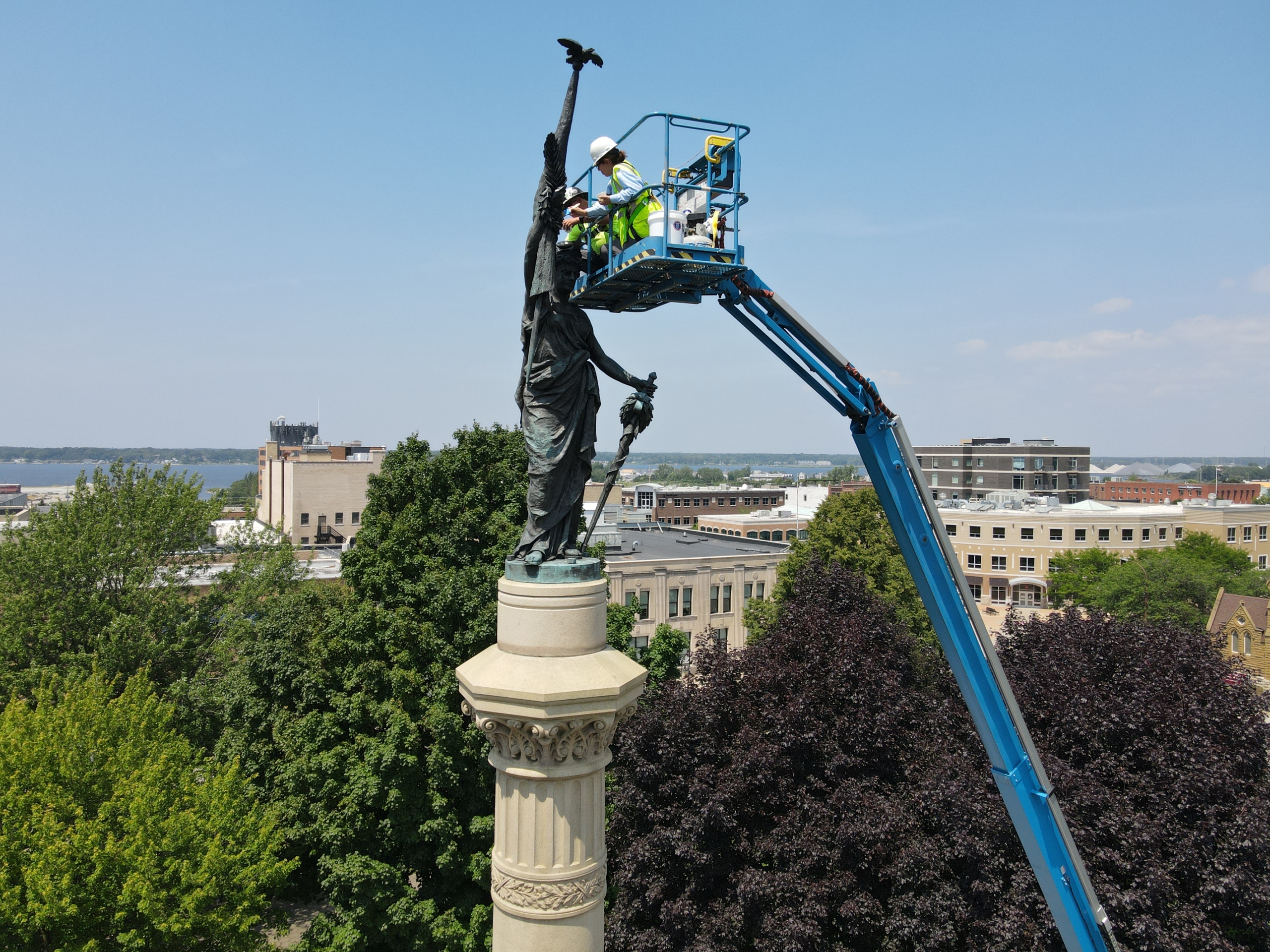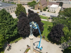 Many of the monuments are located in the Muskegon Historic District which is listed in the National Register of Historic Places. The statuary of Hackley Park had its last comprehensive conservation treatment in 1998. Since then, basic cleaning and waxing was last performed over five years ago by staff from the Lakeshore Museum Center. The professional treatment underway now will ensure the monuments’ continued longevity, as without this work, they are at risk of serious deterioration.